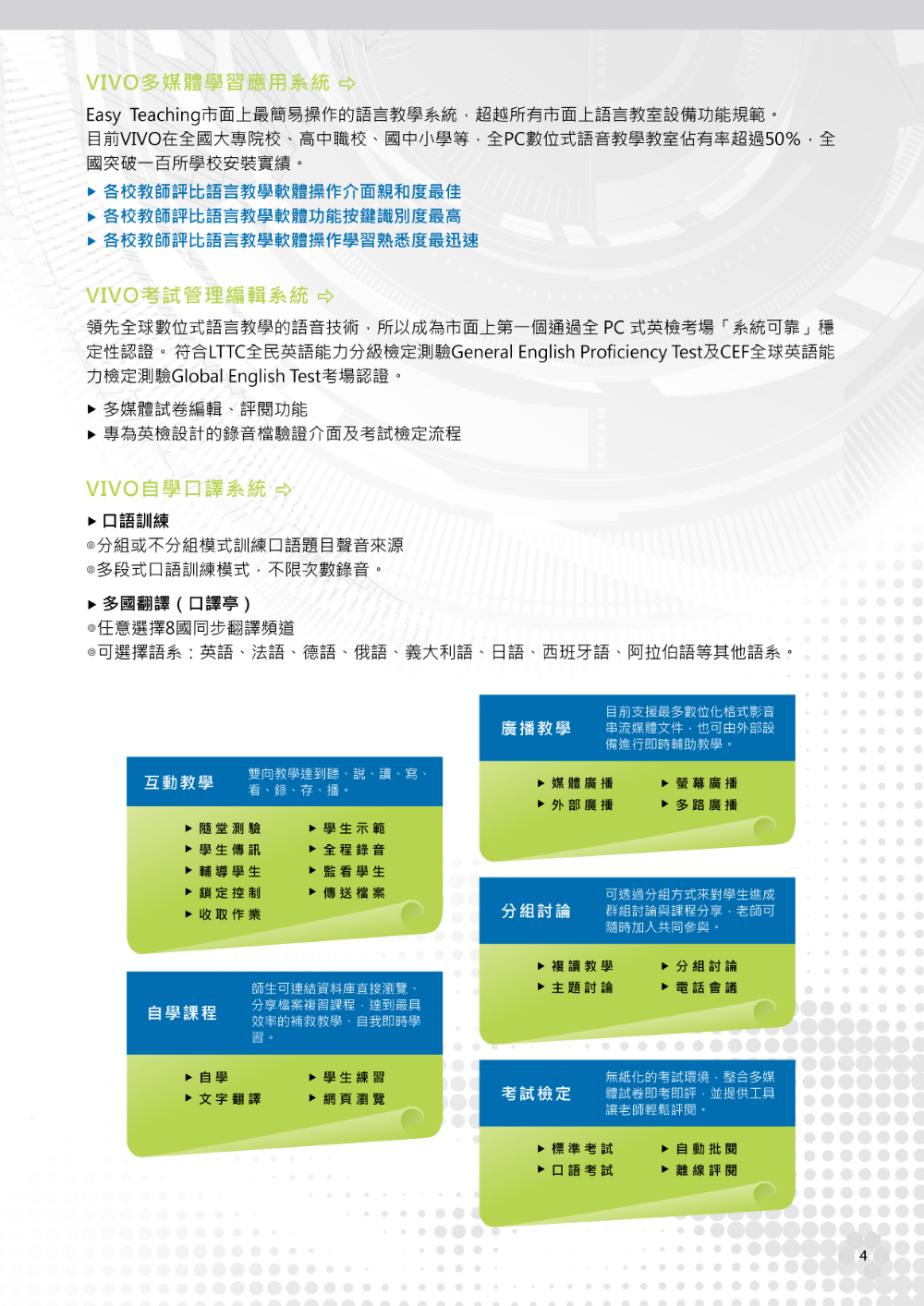 語言教室系統:VIVO 品牌,為LTTC全民英檢中心口語考試指定使用,全國近600所學校使用。VIVO榮獲國家品質金牌獎,操作最簡單,系統最穩定度受全國肯定。VIVO為真正專業級語言教室系統,非電腦廣播軟體改造所能比擬。VIVO聲音品質及流暢度為目前最穩定受全國肯定品牌,絕無其他品牌所能替代。請認明"宇研VIVO"才是真正專業的語言教室品牌