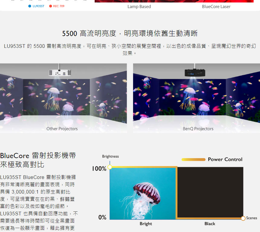 大幅度鏡頭位移、遙控器ID配對、HDBaseT、區網控制、360∘各角度投影、低輸入延遲的快速模式、3D同步輸入&輸出、白平衡調整